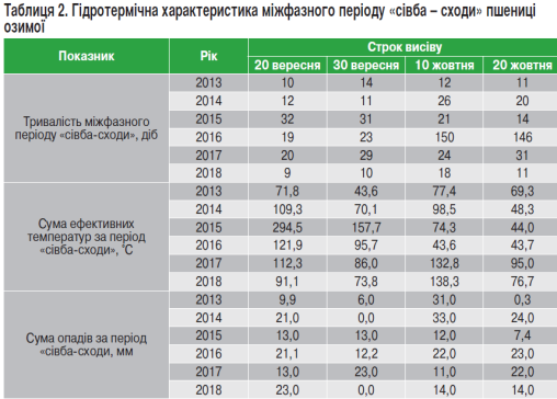 Найкращі умови для росту й розвитку рослин пшениці озимої в осінній період відзначали 2013 року, а найгірші — 2016-го. До того ж терміни висівання найбільше впливали на тривалість міжфазного періоду «проростки — початок кущіння», гідротермічна характеристика якого наведена в таблиці 3.