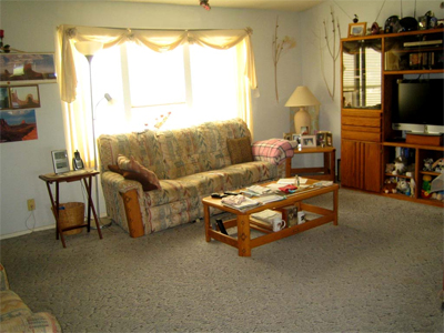 Це центральна, найбільша кімната будинку. Її площа приблизно 30 м2. Меблі дуже скромні: диван, пара крісел, журнальний столик, електрокамін зі штучними дровами і голографічним полум'ям і музичний центр. Ось про останній я хочу сказати особливо. Це телевізор, два записуючі DVD, на одному можна також відтворювати або записувати відеокасети, які були в колишніх відеомагнітофонах, тюнер, касетний магнітофон, потужне радіо та програвач для вінілових дисків.