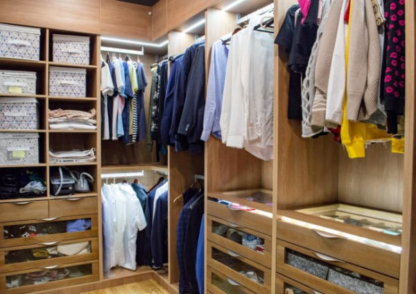 Невід'ємним елементом приміщення для зберігання одягу є високі стелажі. Ви можете зробити їх самостійно, використовуючи МДФ або ДСП, так і замовити в майстерні, а також можна підібрати вже готовий виріб. Верхні полиці стелажів практичніше відвести під речі, що використовуються не так часто. Середина відмінно підходить для розміщення контейнерів, в яких зручно зберігати трикотажні вироби та кошиків для білизни. У цій частині системи краще виділити місце і для секцій з висувними скриньками під дрібниці. Нижню частину всієї системи доцільно використовувати для зберігання взуття, також тут можна виділити відсіки, в які ви складатимете різну побутову техніку – пилосос, зволожувач повітря, праску, швейну машинку тощо. За бажання тут можна виділити місце для сейфа.