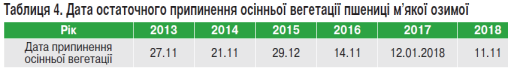 Дата припинення осінньої вегетації значною мірою впливає не тільки на зимостійкість, але і на врожайність пшениці озимої. У роки досліджень (2013–2018) остаточне припинення осінньої вегетації найраніше відбулося в 2016 та 2018 роках — 14 та 11 листопада відповідно, що на один-два тижні раніше від середніх багаторічних термінів (табл. 4).