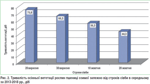 Найкоротшу (53–23 доби) тривалість осінньої вегетації рослин пшениці м’якої озимої, в залежності від термінів висівання, відмічено у 2018 році: припинення вегетації відбулося дуже рано — 11 листопада.