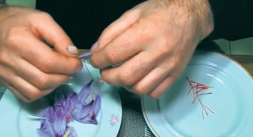 Виймання червоних рилець із квіток крокусу проводять відразу після їхнього збирання, що полегшує сам процес та забезпечує отримання якісної сировини. Для відокремлення червоних «ниточок» можна використовувати свої нігті або невеликі інструменти, такі як ножиці або пінцет. Для виготовлення приправи шафрану використовують лише червоні рильця. Жовті тичинки й фіолетові пелюстки для цього не використовують! Поки ми ще не придумали, що з ними робити, тому просто викидаємо їх.